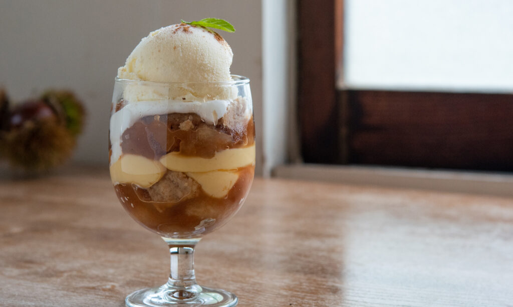 セルクル秋冬の定番のグラスタルトタタンです。シナモン、ラム酒と柔らかく煮た紅玉を タルトクッキー、ホイップと重ねて アイスクリームを乗せました。