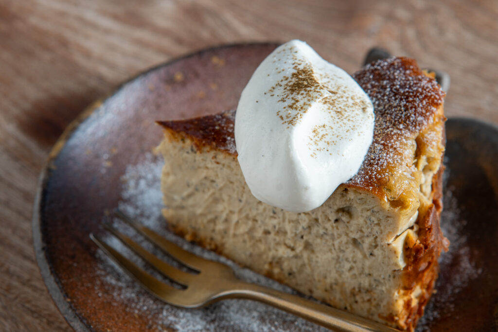 クリームチーズとサワークリームをブレンドした濃厚なバスクチーズケーキに生クリームで濃いめに煮出したほうじ茶と自家製キャラメルをイン。