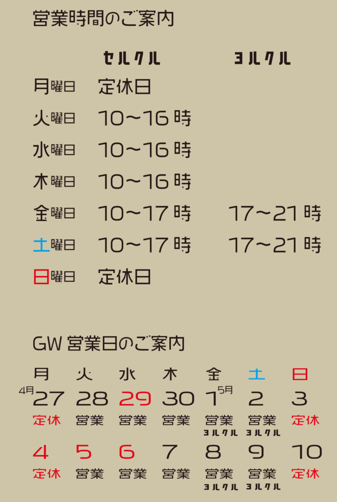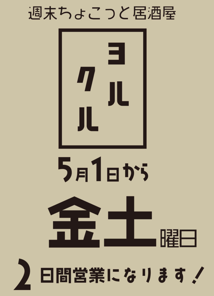 毎週土曜日の夜だけ営業していた『ちょこっと居酒屋ヨルクル』ですが、みなさまの熱い要望を受け、5月1日の金曜日から毎週金曜日と土曜日の2日間営業になります。営業時間や休みを下に整理しましたので、ご参考にしてください。